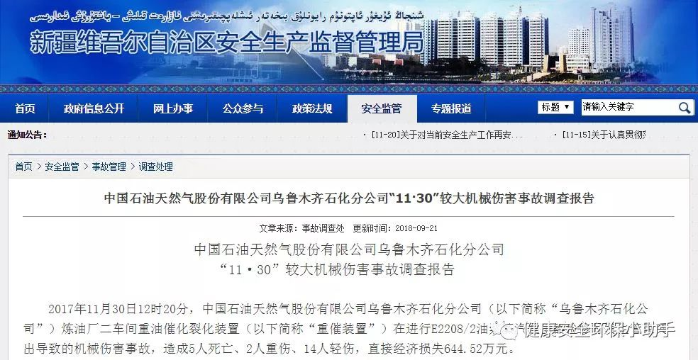 中国石油乌鲁木齐石化分公司“11·30”较大机械伤害事故调查报告(节选)